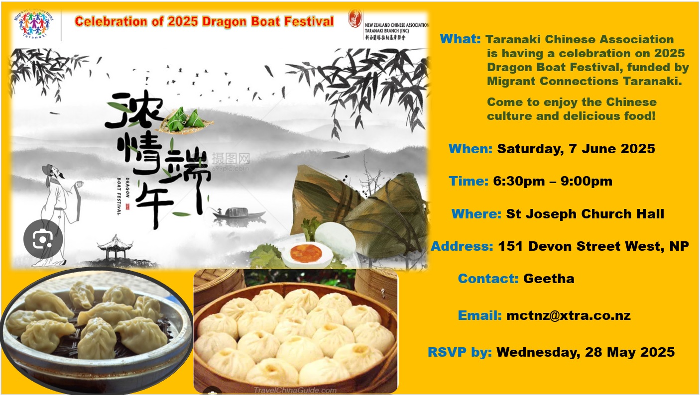 受Migrant Connections Taranaki的赞助和本会志愿者的支持,本会于6月7日,从晚上六点半开始,在St Joseph 教堂大厅举行了2025年端午节庆祝活动。除了本会近130会员,我们还邀请了约100位其它族裔的客人和我们一同庆祝。嘉宾包括市政府议员,大使馆领事部主任及领事,总会会长,多民族委员会主席等。 活动包括文艺表演,以及抽奖,抢糖果和体验中国文化,以及品尝美味的中国食物。活动收到了多方好评,并被多种渠道传播。我们也争取让该活动以后继续。