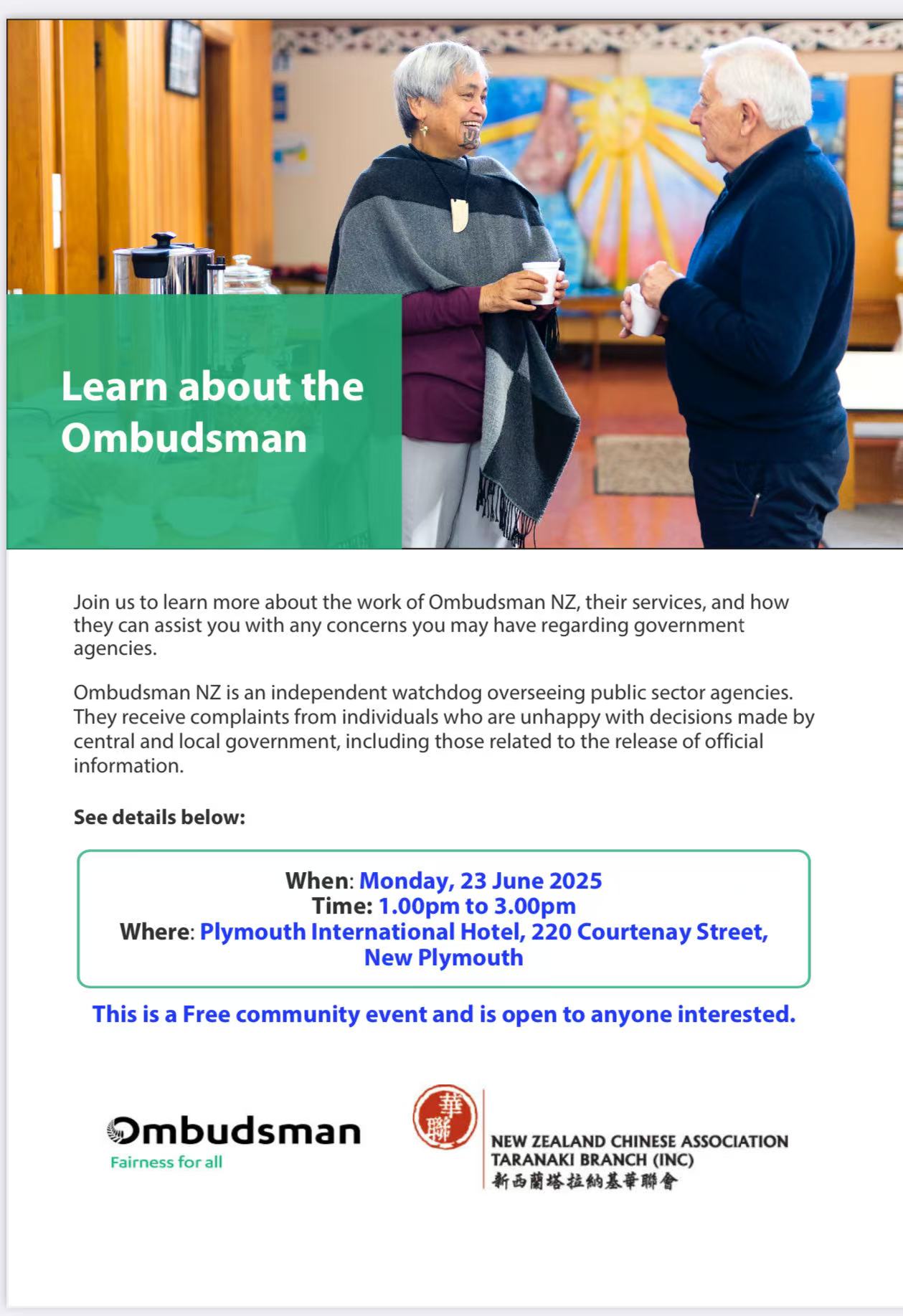 6月23日,新西兰国会直属的申诉专员从惠灵顿来到新普利茅斯,与本地华人代表举行了一场见面会。